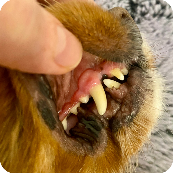 To check your pet’s gums, gently lift their upper lip in the region of their whiskers, so you can see the gum area just above their upper canine tooth. |